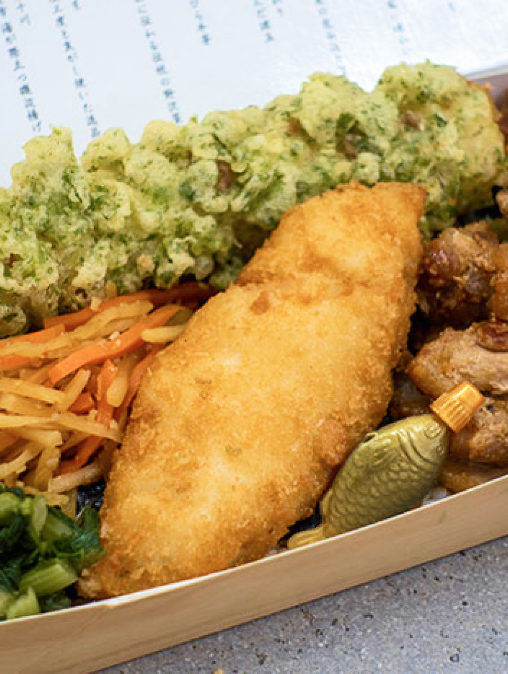 The rice is a perfect blend of Niigata brand rice "Shinnosuke" and glutinous barley. The seaweed is "Ukinagashi" from the Seto Inland Sea, which has a firm texture, and the Isobe-age (fried fish cake) is made with takewa from Shiogama, Miyagi Prefecture and aonori (green laver) from the Shimanto River in Kochi Prefecture. All the ingredients in the bento are packed with care and no corners have been cut.